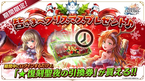 2025年12月11日(木) メンテナンス後~2025年12月25日(木) 12:59まで入手できる「復刻聖夜の引換券」(クリスマス)で交換する際のおすすめキャラとアークを掲載しています。