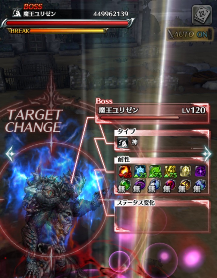 ボスは魔王ユリゼン。タイプは神。炎が弱点で光と闇に耐性がない。